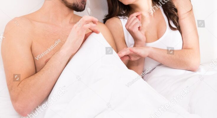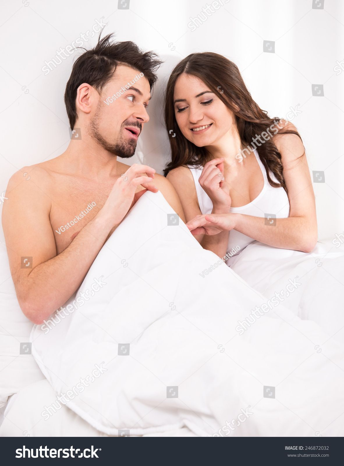 Surprised and shocked young woman in bed is looking down at penis under white covers …Hard pics see first comment